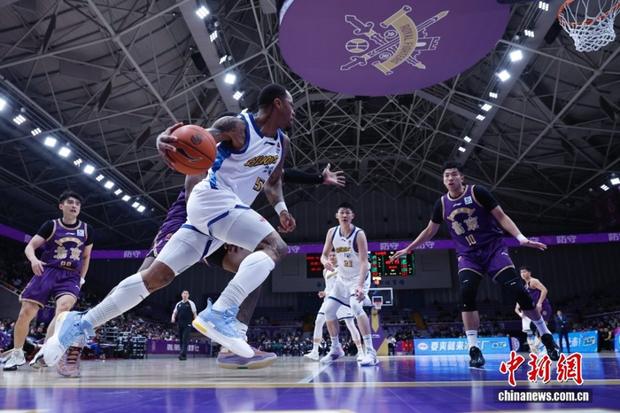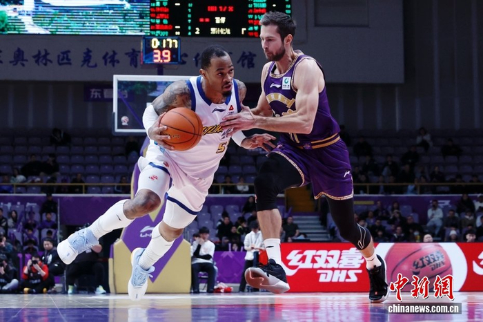 1月21日,在北京奥体中心体育馆举行的2025-2026中国男子篮球职业联赛(CBA)常规赛比赛中,北京控股队主场79比102负于浙江方兴渡队。图为北京控股队基兹林克(紫衣)在比赛中带球进攻。中新社记者 韩海丹 摄